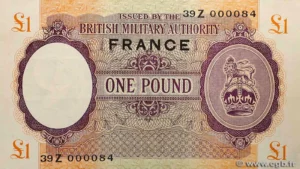 Un billet de One Pound BMA (Réf. #Pick.M6C, Fayette-Dessal #VF.15.01), est un billet non émis produit en quantités très limitées avec la surcharge « FRANCE » (voir mon article du 2 mai 2014 : «