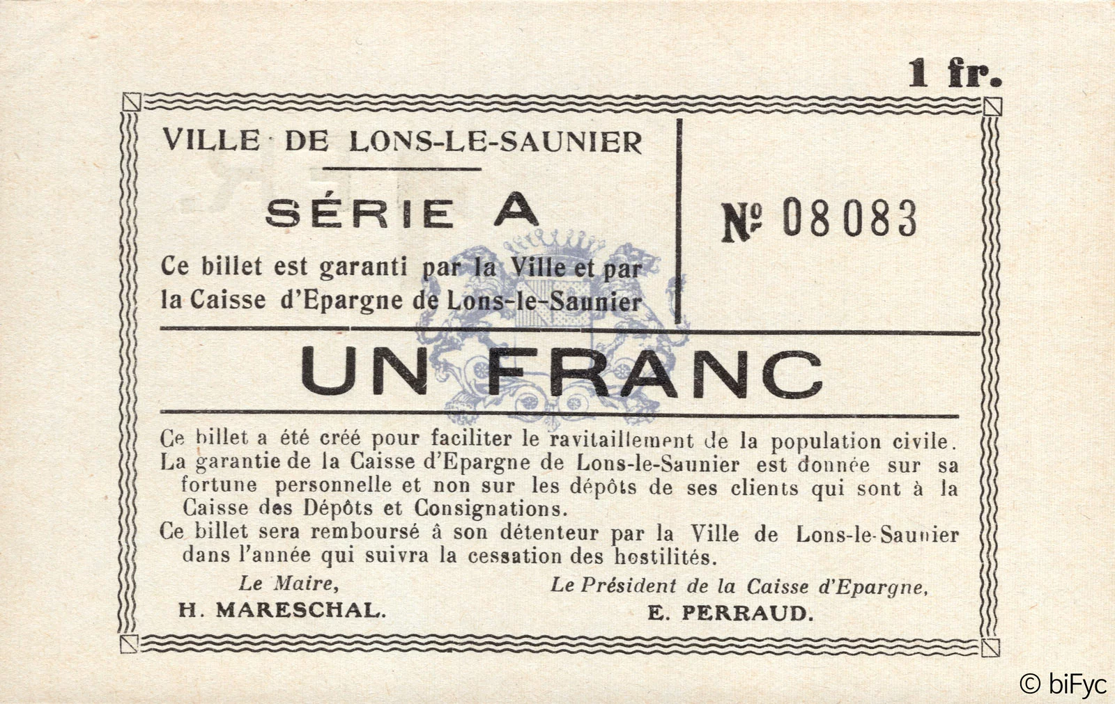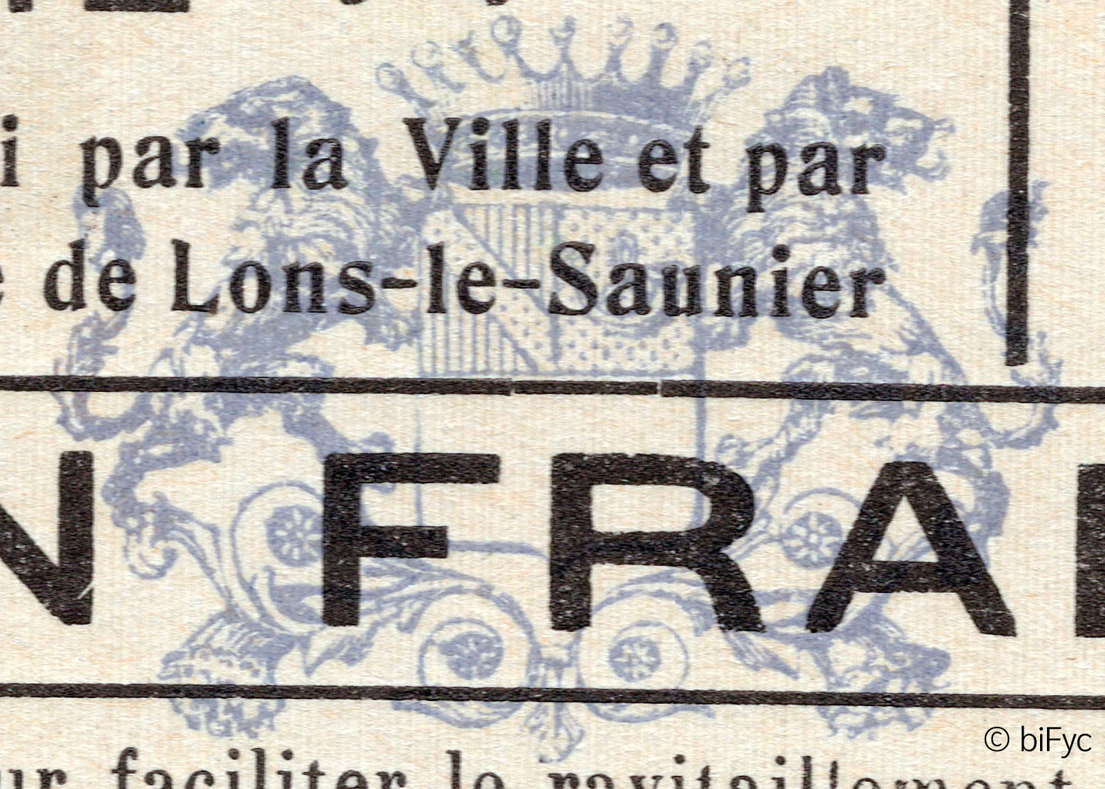 Nota : 22 autres billets sont conservés dans les archives de la Mairie de Lons-le-Saunier. Ces exemplaires sont numérotés : 08501, 08502, 08719, 08981, 08982, 08986, 08987, 08988, 08989, 8990, 08991, 08992, 08993, 09506, 14606, 14607, 14608, 14609, 14610, 14611, 14612 et 14613.