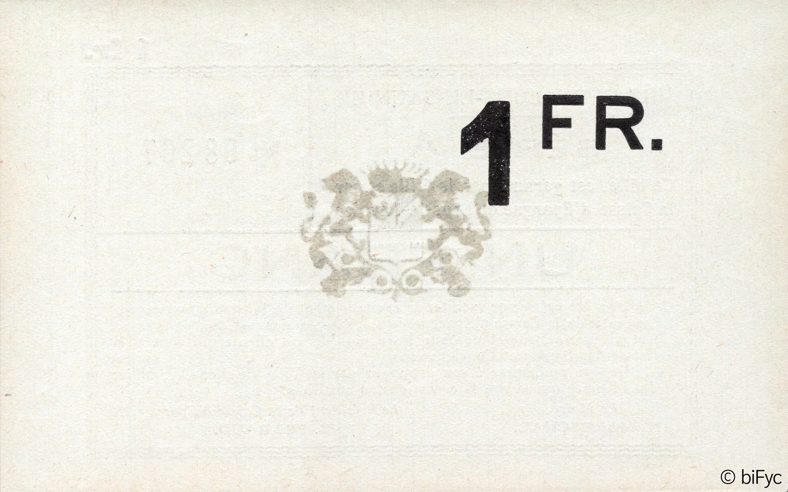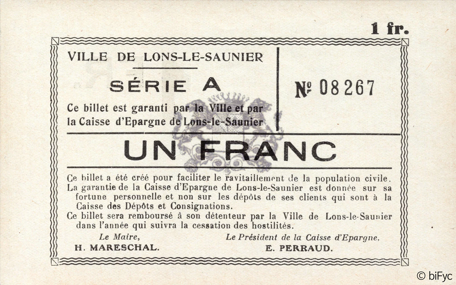 Il y a quelques jours, j’ai observé une coupure de 1 franc type 1940 de la ville de Lons-le-Saunier (Réf. BU.42.01) en vente à 40€ chez un marchand slovaque. Le billet m’a tout de suite intrigué, car les petites armoiries présentées en son centre n’étaient pas comme d’habitude imprimées en bleu, mais en noir ! J’ai d’abord pensé que le billet était un faux, puis j’ai pris le risque d’en faire l’acquisition. Le billet, numéroté 08267, est en parfait état :