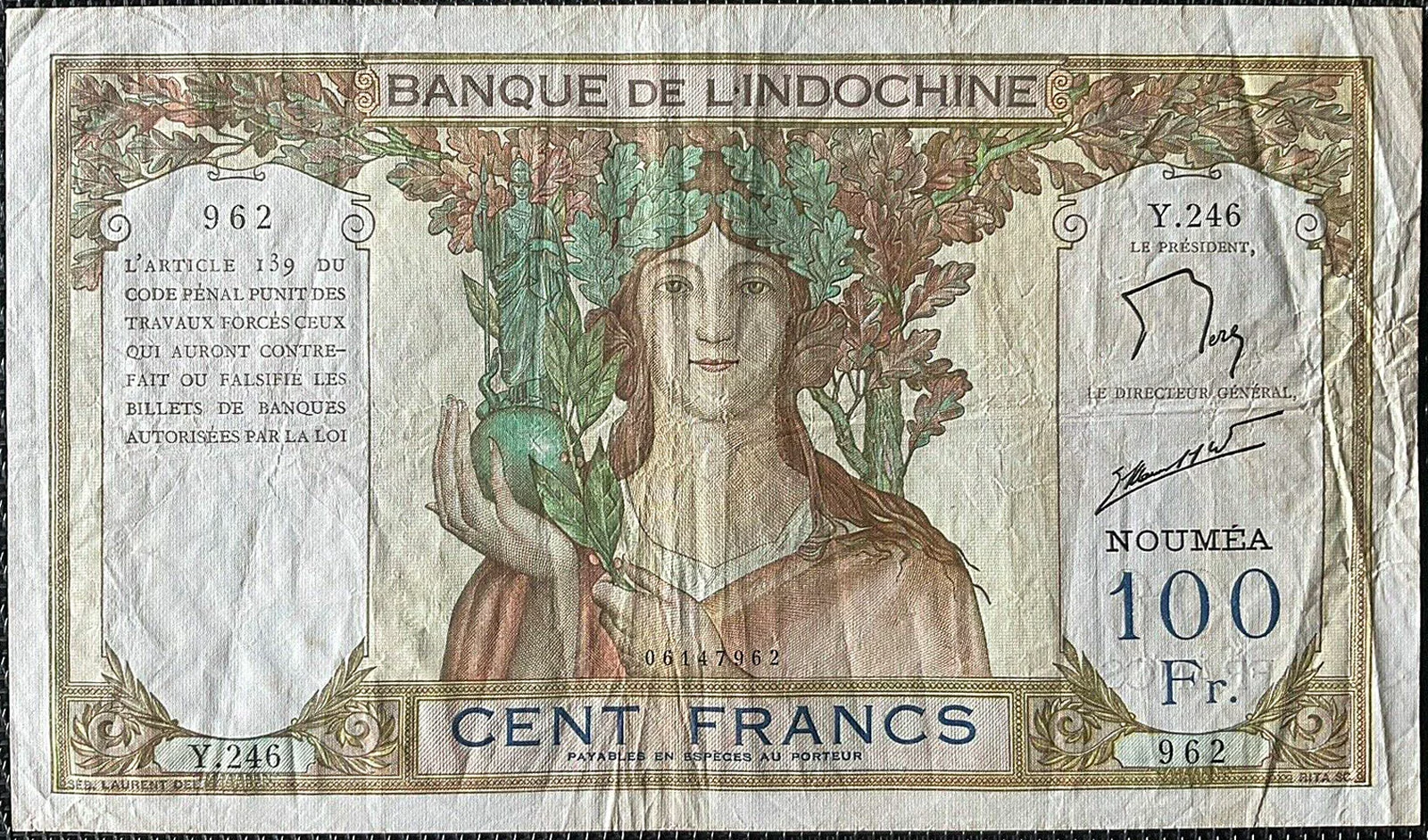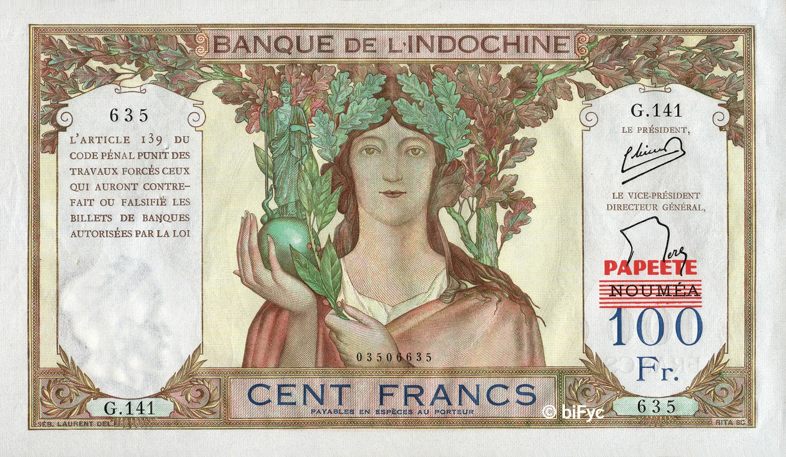 C’est trop facile. Les fausses coupures que « citygroundhero-6 » tente d’écouler depuis des années sur ebay sont très variées et assez faciles à détecter. Depuis quelques temps, on dirait qu’il s’acharne à contrefaire des coupures de la Banque de l’Indochine. On peut dire que ça tombe bien, puisque ces billets sont mon quotidien du petit matin à la nuit tombée. Et puis avec les 10000 billets recensés en inventaire à date, il va lui être difficile à présent de passer entre les gouttes. La preuve encore avec cette vente d’un faux 100 francs Nouméa surchargé Papeete (Réf. Kolsky/Muszynski #KM514, Pick #016A, The banknote Book #B313 et prochainement BIC.413). Il a donc utilisé un billet émis pour la Nouvelle-Calédonie (NOUMÉA) numéroté Y.246-962 en y apposant une fausse surcharge PAPEETE :