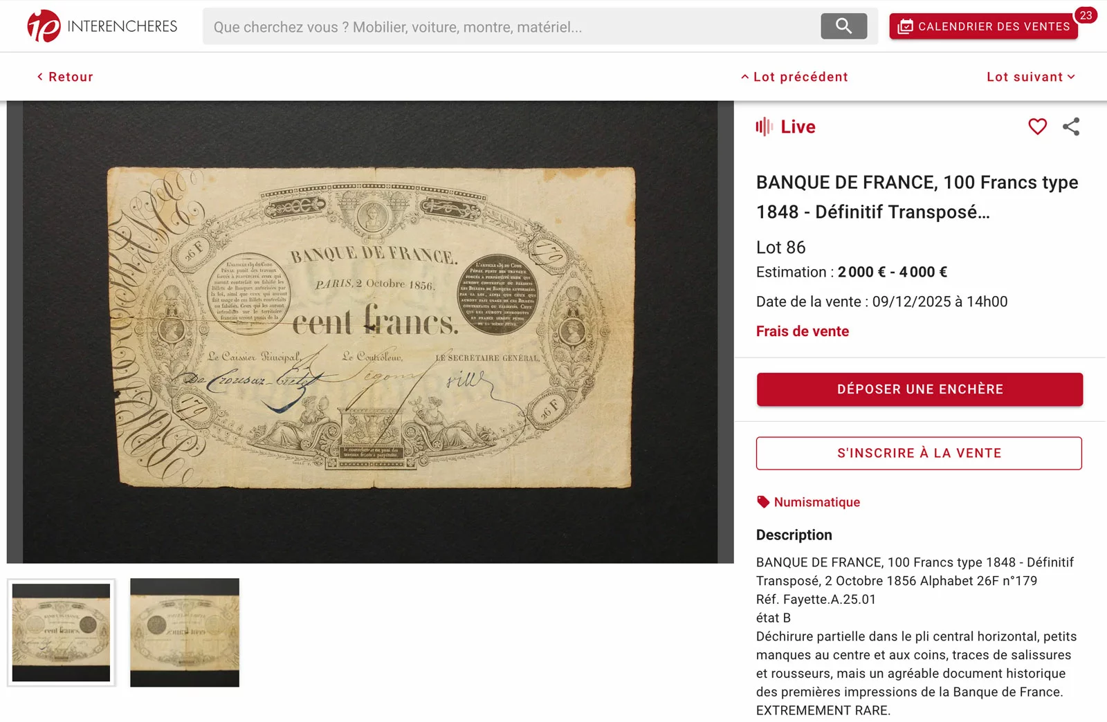 Un très rare exemplaire du 100 francs type 1848 – Définitif transposé (Réf. Fayette-Dessal #F.A25.01, Pick #45), sera mis à la vente le 9 décembre 2025 par un commissaire-priseur de Narbonne (lot n°86). Pour ceux qui ne pourrons pas se rendre sur place, vous pourrez tenter votre chance sur le site interencheres.com :