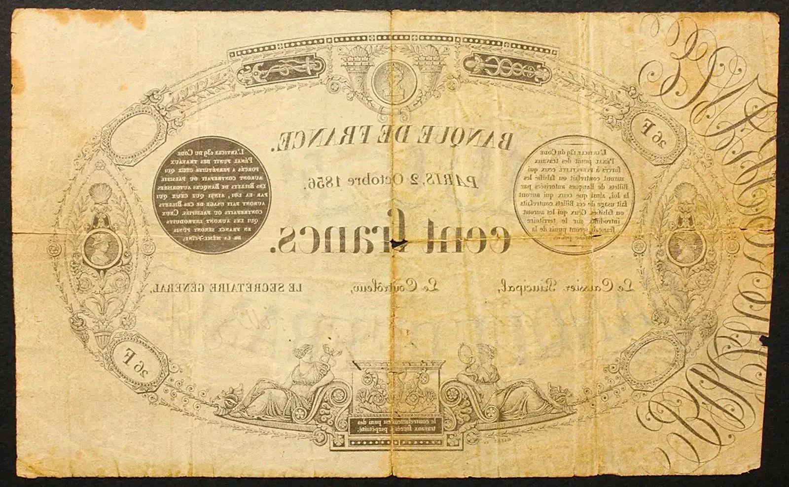 Le billet dont l’état a été estimé à B (par précaution sans doute), est daté « PARIS, 2 Octobre 1856. » et numéroté 26F 179. La coupure comporte les titulatures avec Le Caissier Principal, Le Contrôleur, et LE SECRÉTAIRE GÉNÉRAL, De Crousaz-Crétet, Doisy (ou ses délégués) et Ville. Les signatures sont apposées à la griffe, mais seule la signature du Contrôleur reste manuscrite. Le numéro du billet « 179 » (inscrit à la main) et l’alphabet imprimé « 26F », sont indiqués à deux reprises et inversés (en haut et en bas) dans la bordure de la frise ovale. Le verso est imprimé à l’identique inversé :