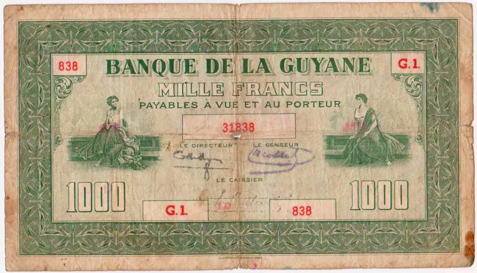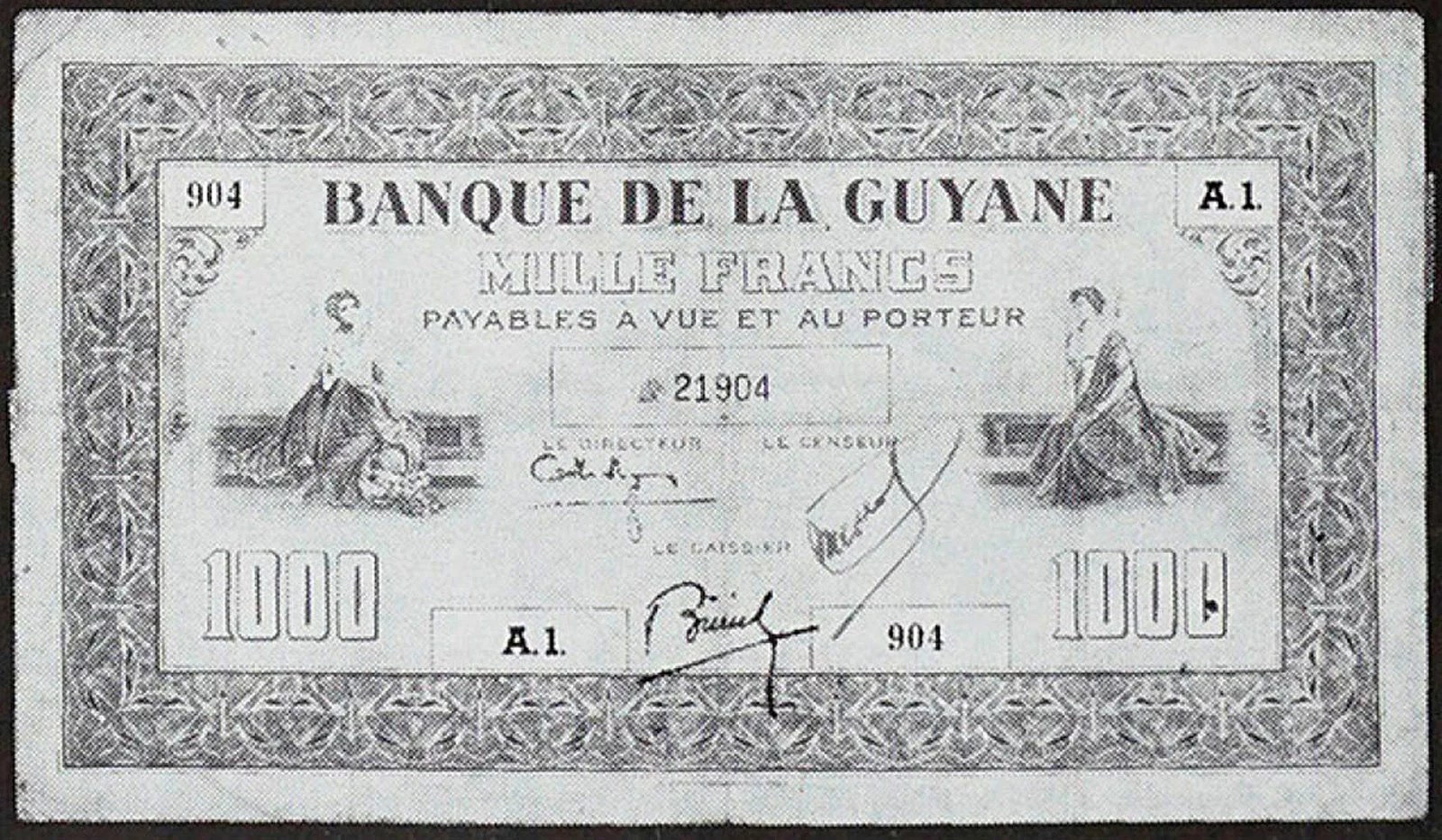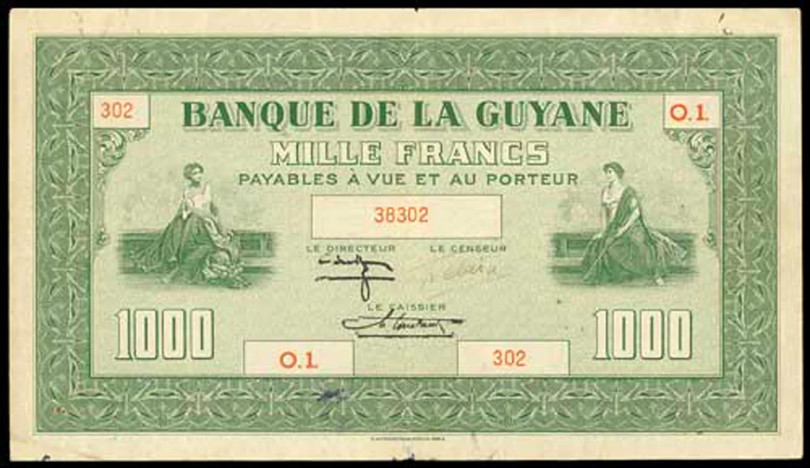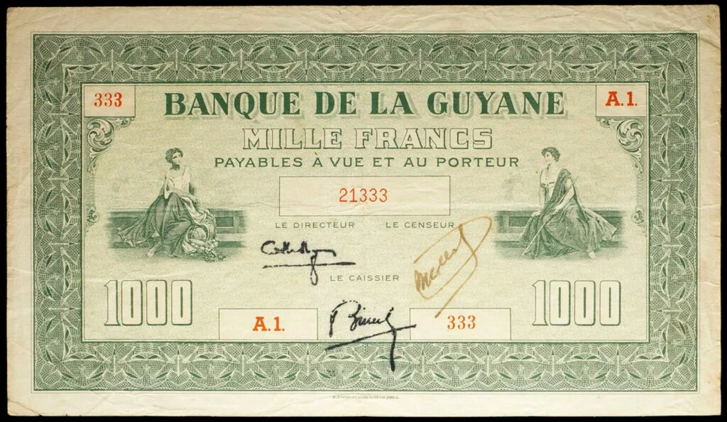 Lors de la vente « Banknotes E-Auction 2 » proposée par MDC Monaco, les 31 janvier et 1er février 2026, un billet de 1000 francs type 1942 de la Guyane française (Réf. Pick : #15 , The Banknote Book : B219 ou Kolsky : #K215), a réalisé le prix très flatteur de 12400€ frais inclus (lot #2020) :