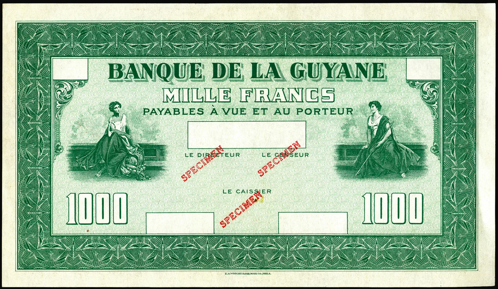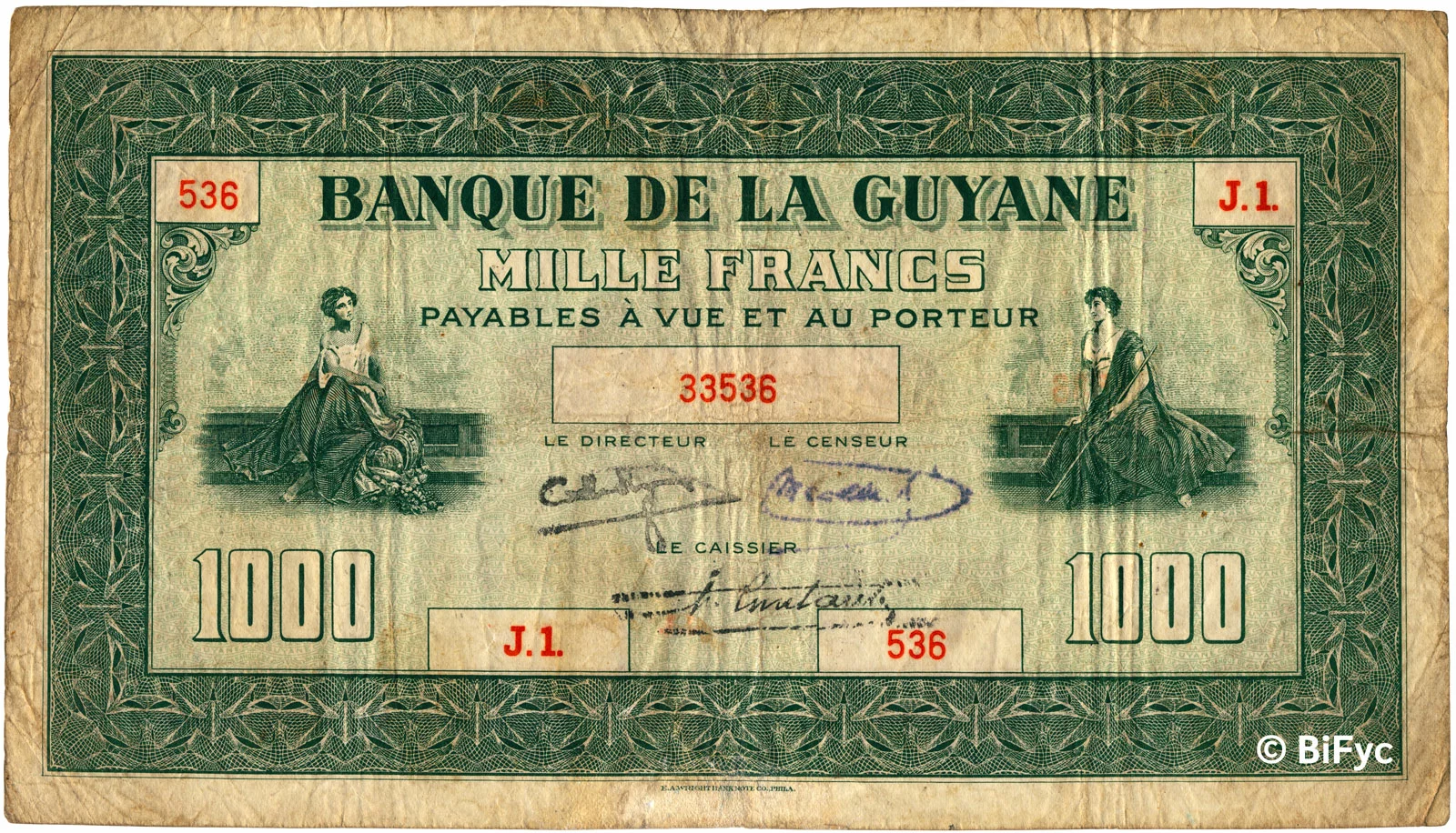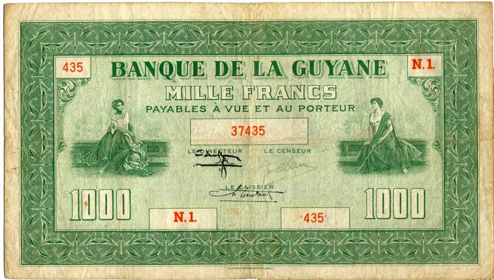 Lors de la vente « Banknotes E-Auction 2 » proposée par MDC Monaco, les 31 janvier et 1er février 2026, un billet de 1000 francs type 1942 de la Guyane française (Réf. Pick : #15 , The Banknote Book : B219 ou Kolsky : #K215), a réalisé le prix très flatteur de 12400€ frais inclus (lot #2020) :