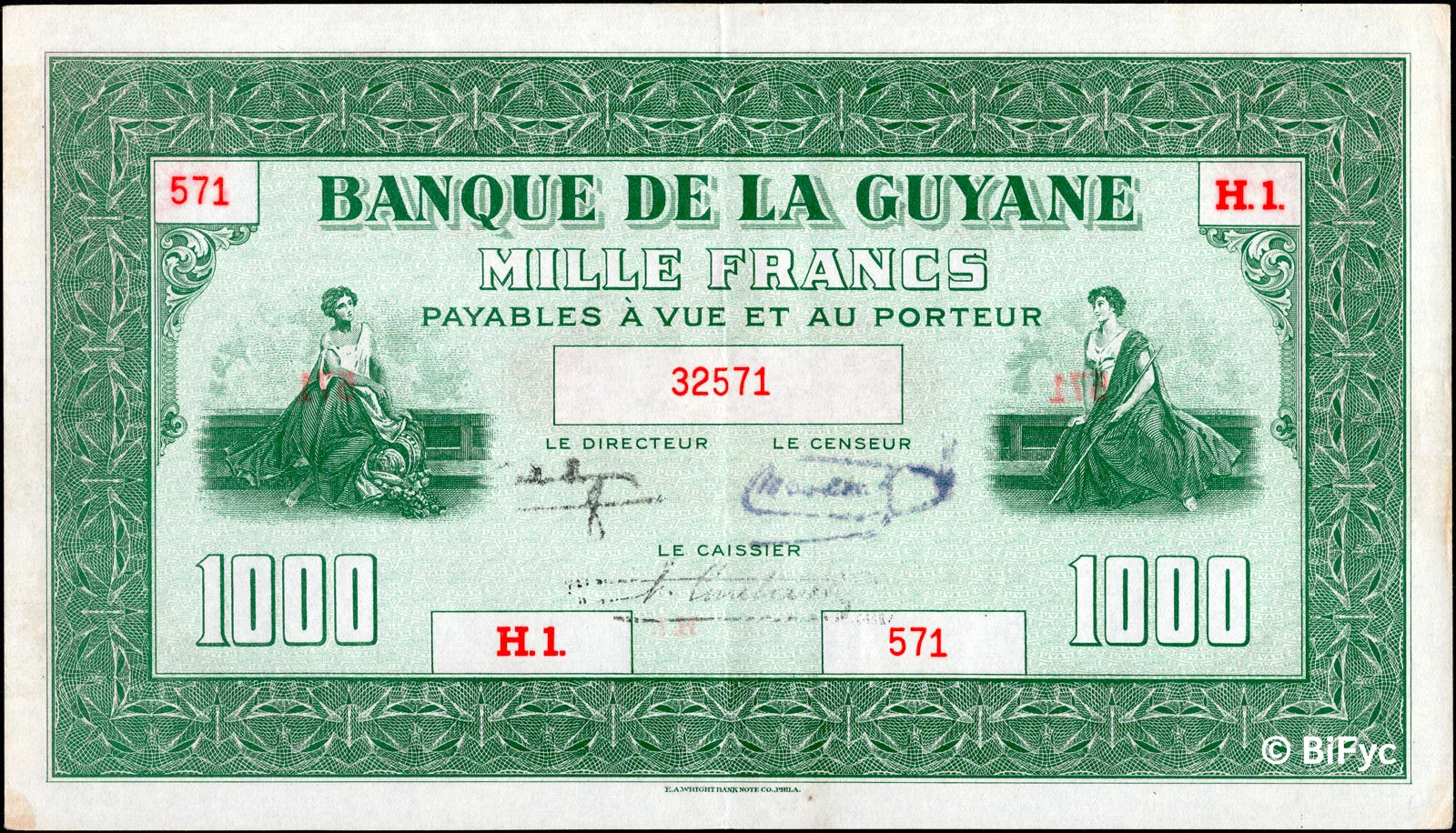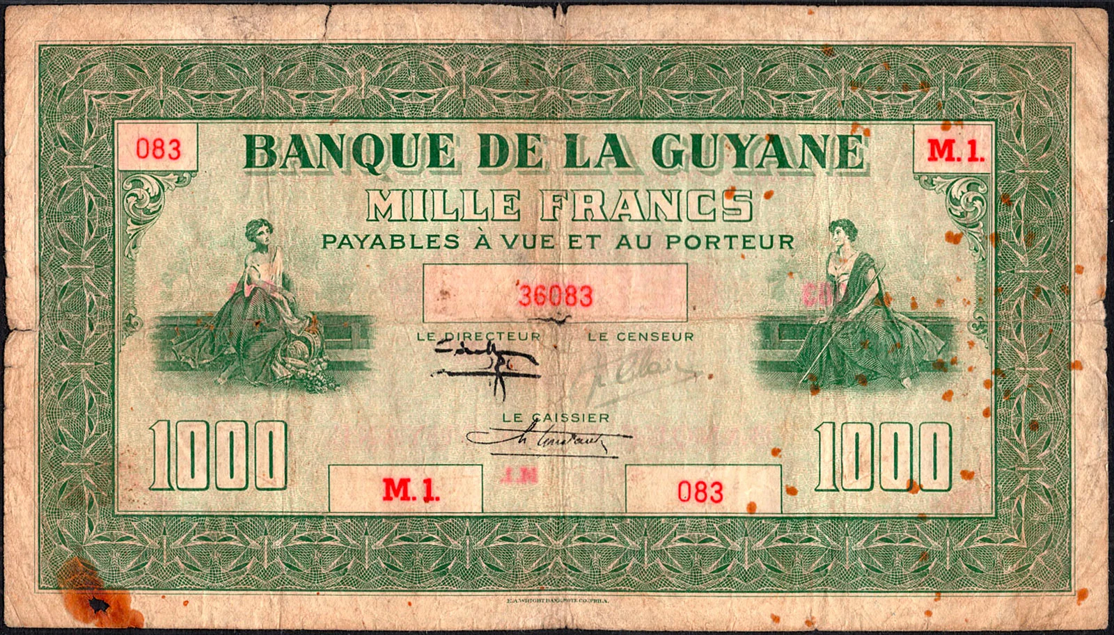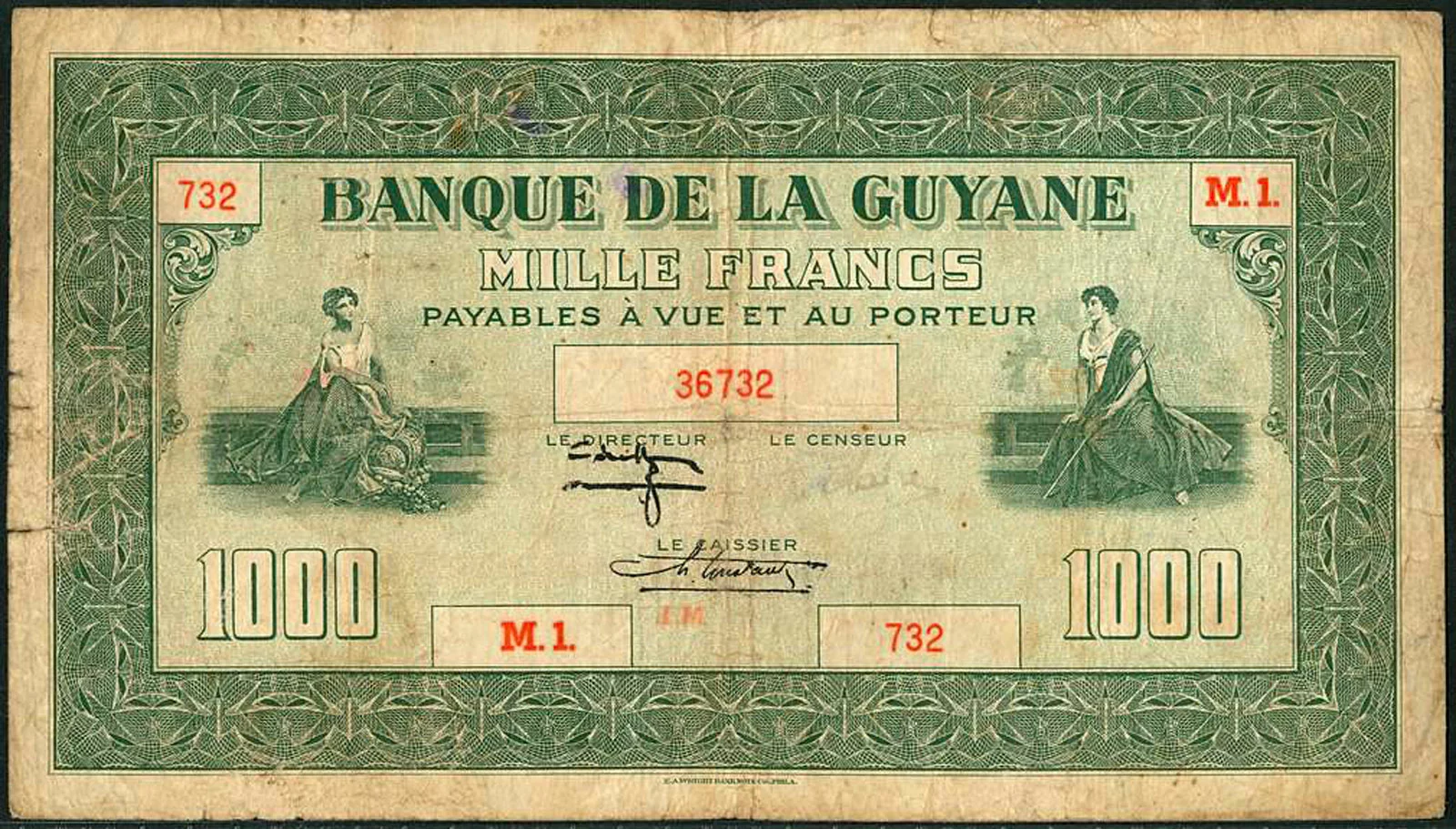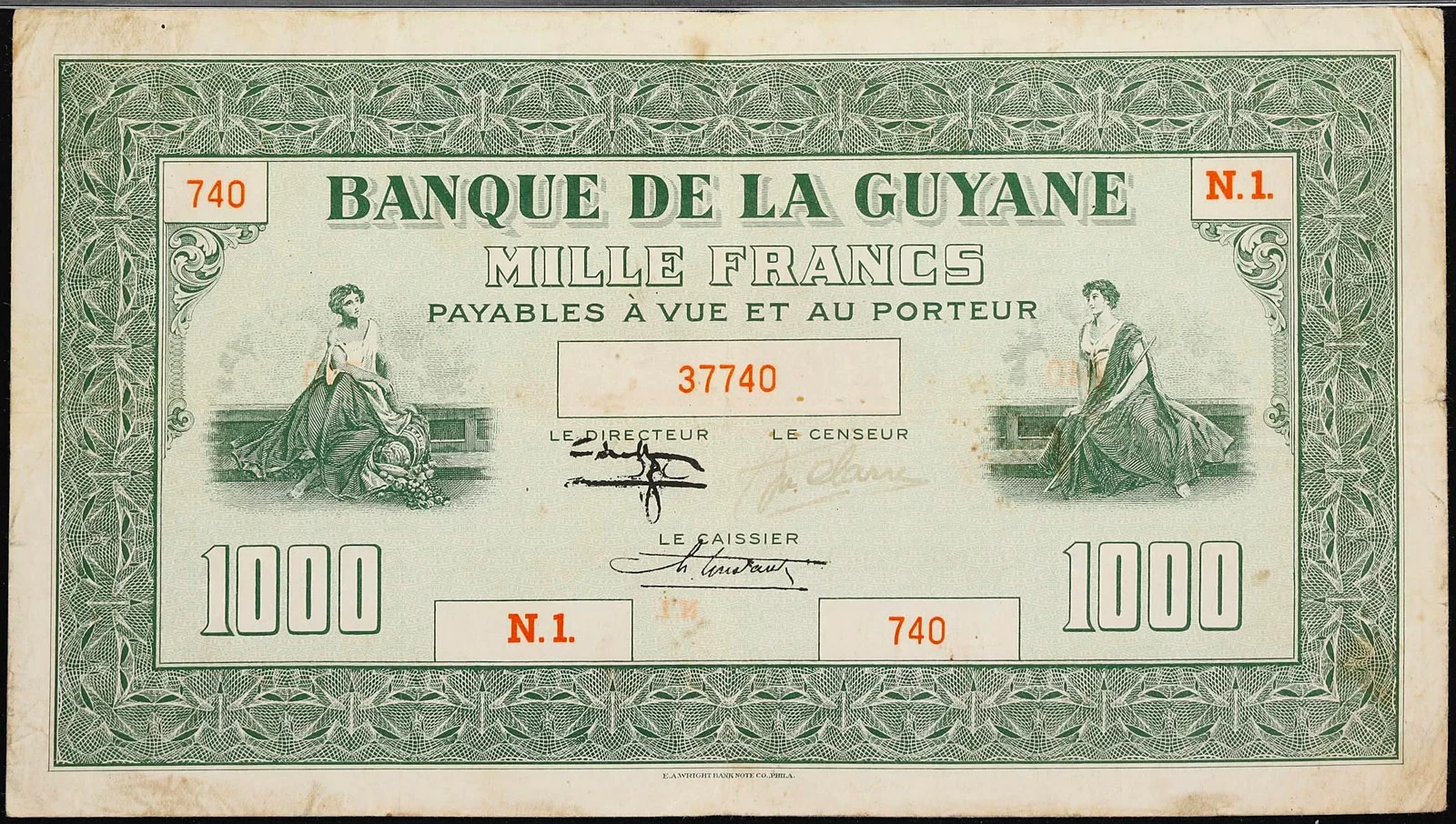 Lors de la vente « Banknotes E-Auction 2 » proposée par MDC Monaco, les 31 janvier et 1er février 2026, un billet de 1000 francs type 1942 de la Guyane française (Réf. Pick : #15 , The Banknote Book : B219 ou Kolsky : #K215), a réalisé le prix très flatteur de 12400€ frais inclus (lot #2020) :