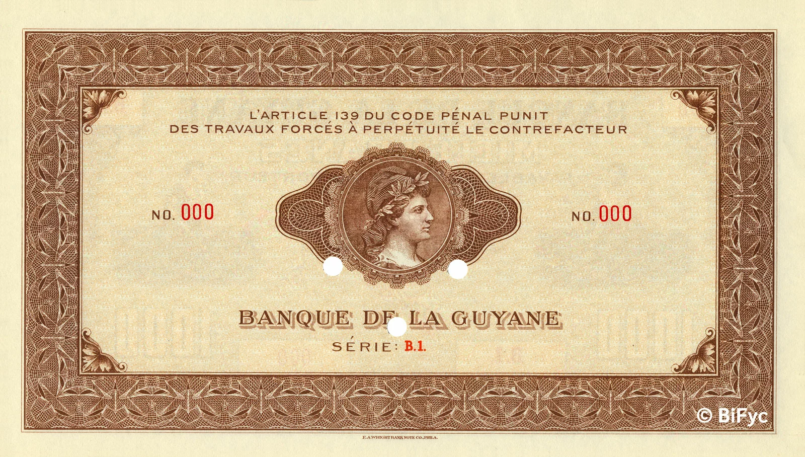 Type 1 : B.1-000. C’est le spécimen le plus proposé en vente. Le billet est perforé de trois trous d’annulation à l’emplacement des signatures et surchargé SPECIMEN en rouge en oblique au recto. Une vingtaine d’exemplaires sont recensés :
