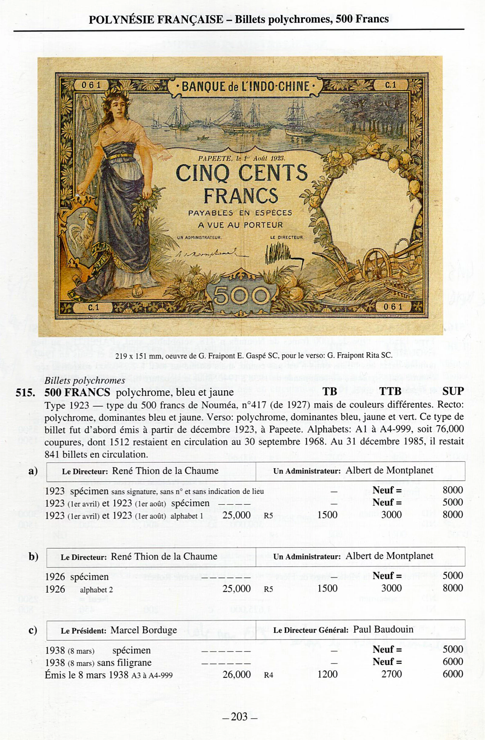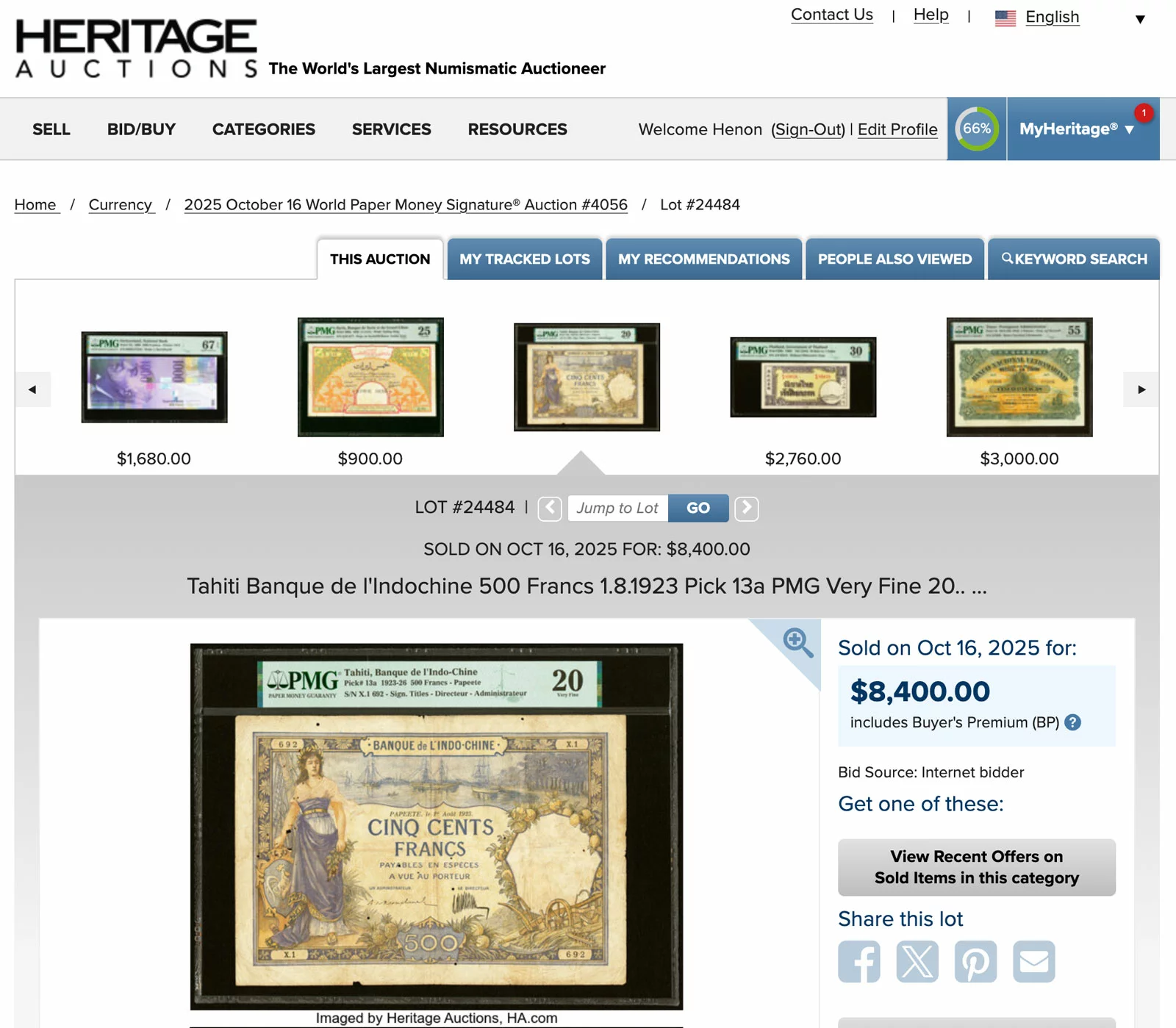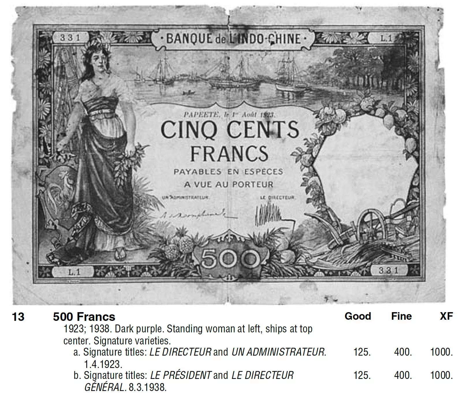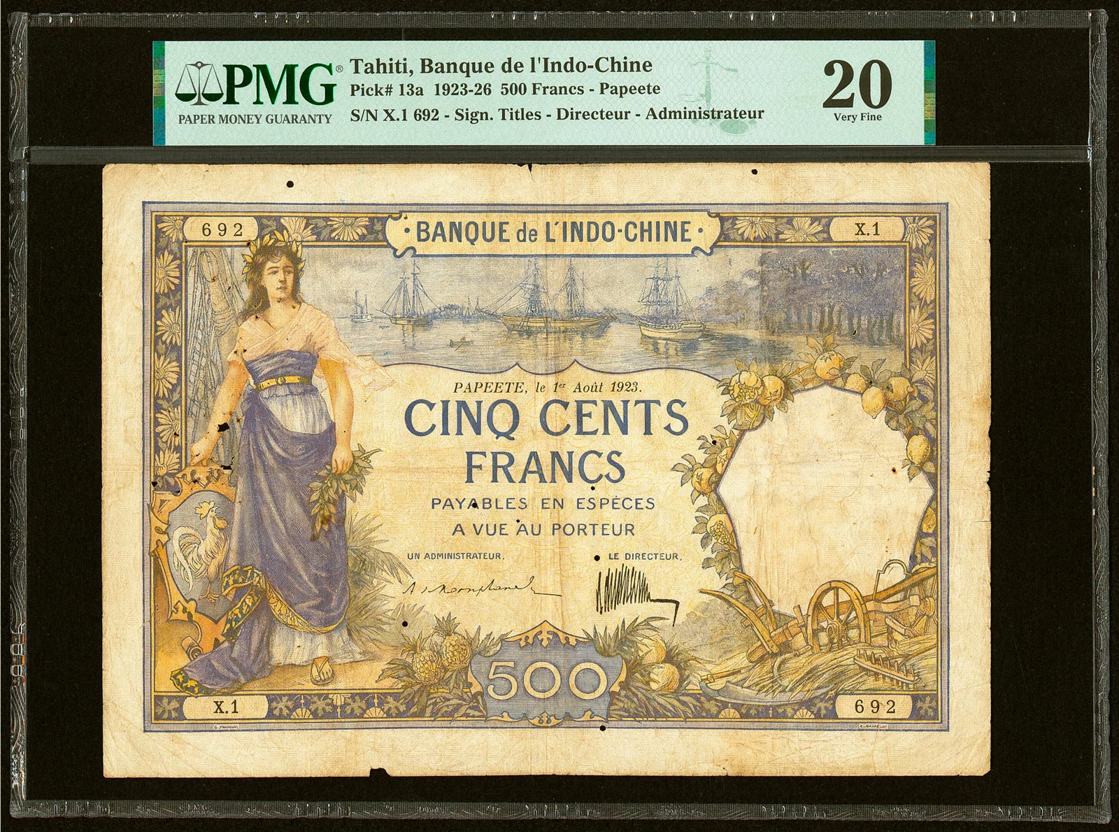 Enfin un exemplaire vu à la vente… Le 16 octobre 2025, la société américaine Heritage Auctions a proposée une vente aux enchères (2025 October 16 World Paper Money Signature® Auction #4056), dans laquelle se trouvait un très rare billet de 500 francs type 1923 Papeete (Réf. Kolsky/Muszynski #KM515a, Pick #013a, The banknote Book #B309a) :