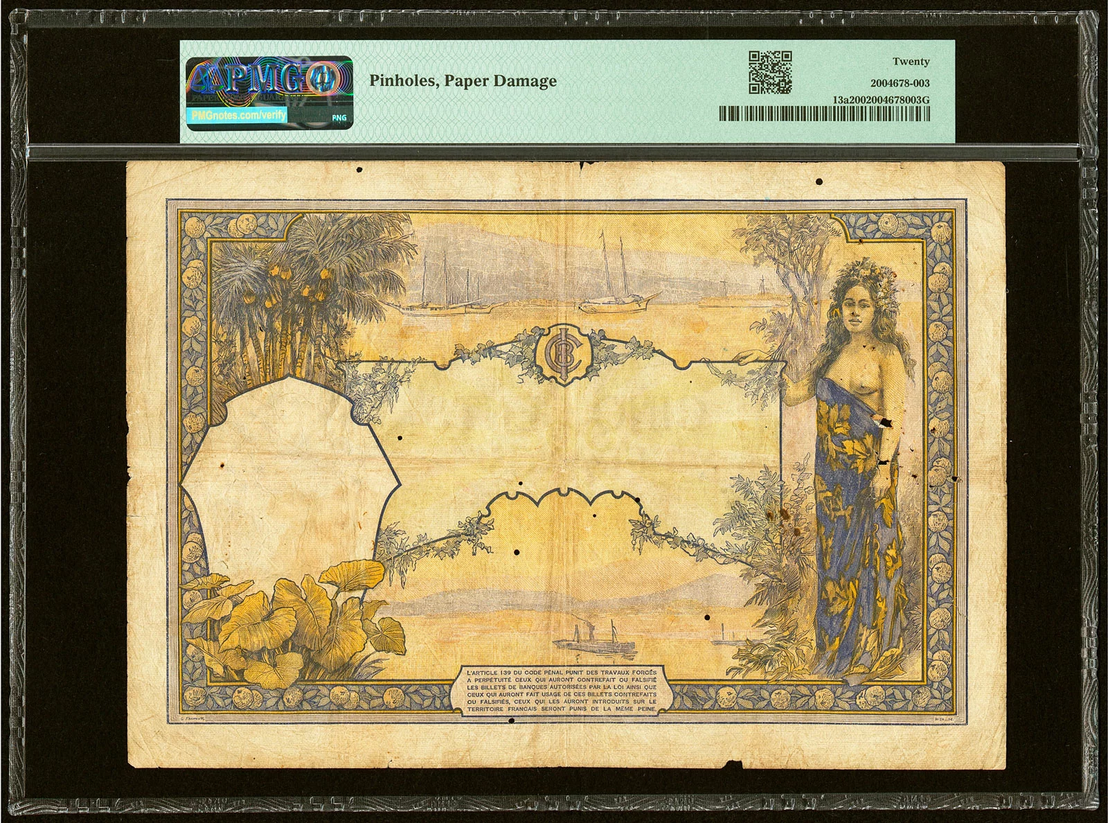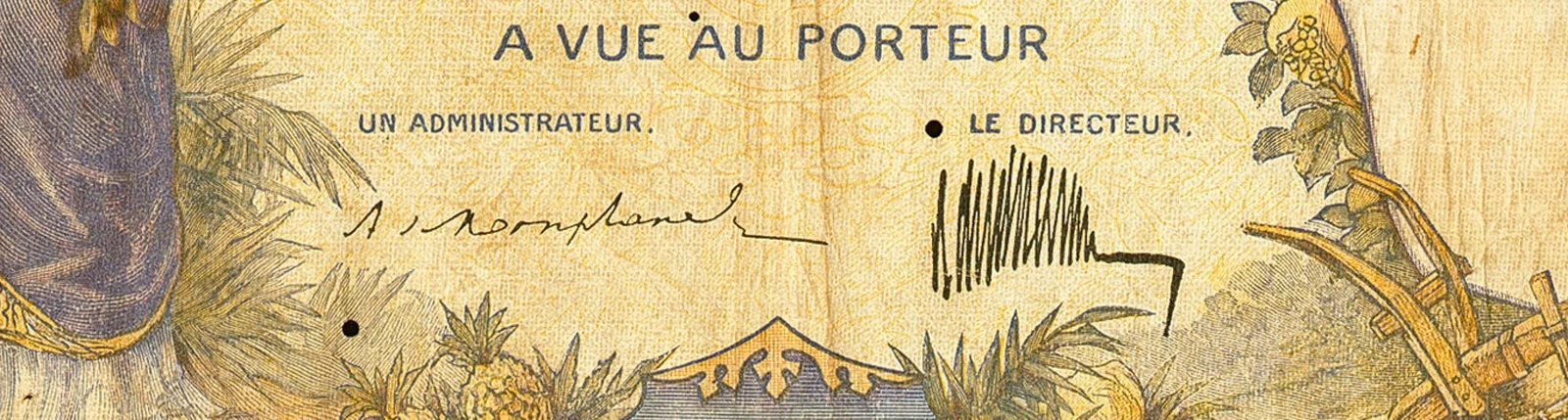 Cet exemplaire, gradé PMG 20, a réalisé le prix de 8400$ (frais inclus) ; une somme qui pourrait paraître très conséquente pour un billet de Tahiti en TTB. Cependant, il s’agit seulement du 3e exemplaire retrouvé pour cette variante avec la combinaison de deux signatures imprimées (Un Administrateur, Albert de Montplanet et Le Directeur, René Thion de la Chaume) :