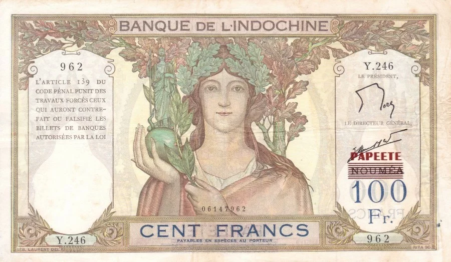 Contexte historique : mis en circulation en 1945 dans les territoires occupés par les troupes françaises et alliées, les billets du « Trésor Français » ont aussi été utilisés par les troupes basées à Chypre et sur les bâtiments de l’escadre de l’expédition de Suez en 1956. Ces billets sont facilement reconnaissables car ils comportent une mention « Forces Françaises en Méditerranée Orientale » et sont reconnaissables par la présence de deux surcharges noires occultant les mentions « Territoires occupés » :