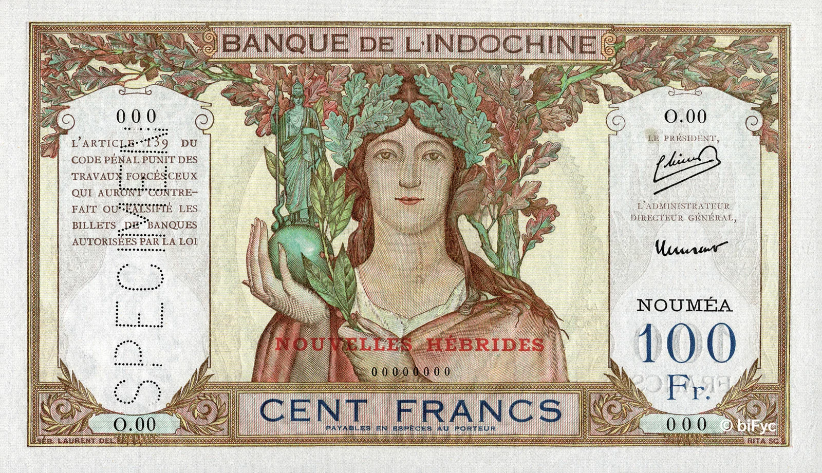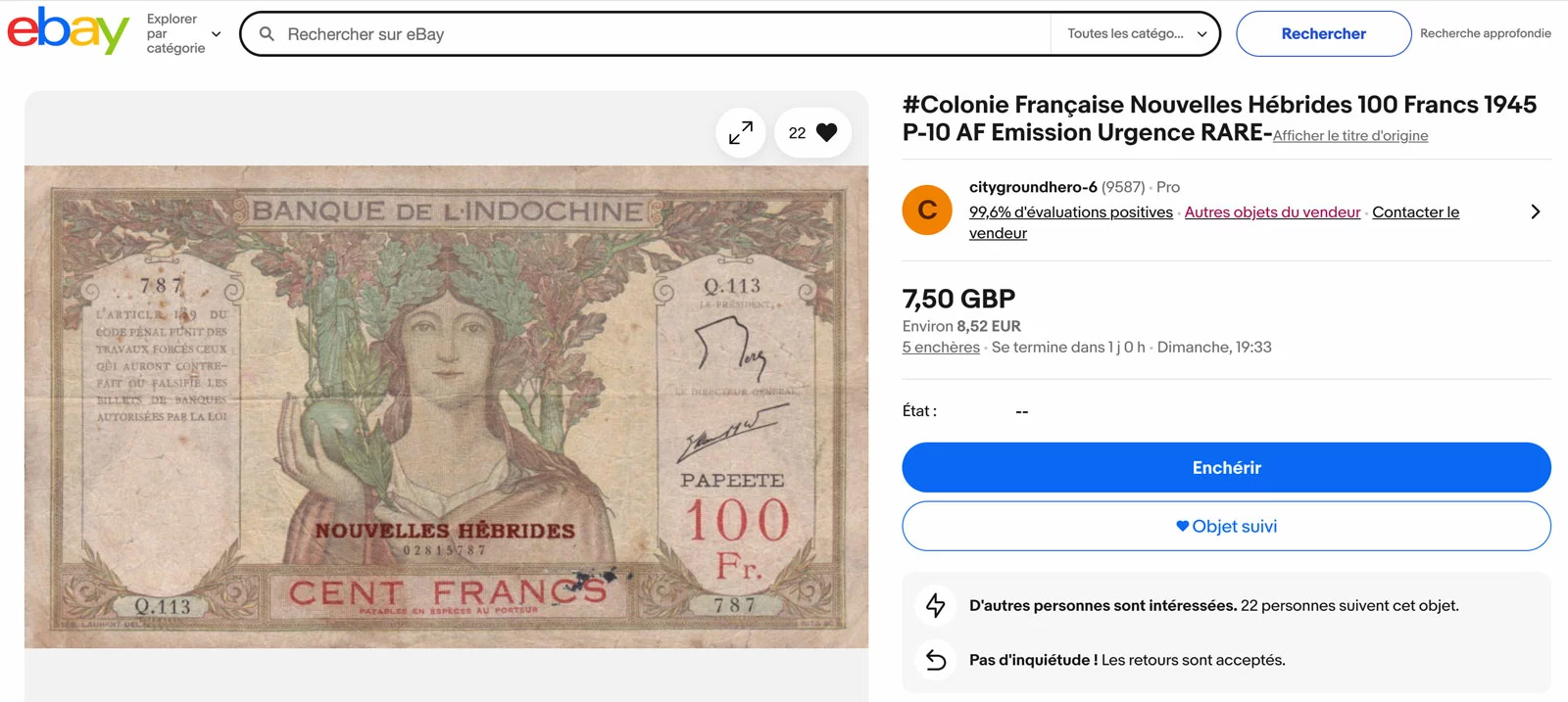 Décidément, notre champion anglais de l’arnaque n’est toujours plus à court de créativité et de médiocrité. Cette fois, il nous propose un billet de 100 francs type 1931 ruines d’Angkor I surchargé « Nouvelles Hébrides » (Références : Kolsky/Muszynski #KM719b, Pick #010c, The banknote Book #B206c et dans le futur ouvrage : BIC.412b). Le billet proposé à la vente est numéroté Q.113-787 et comporte une fausse surcharge « Nouvelles Hébrides » :