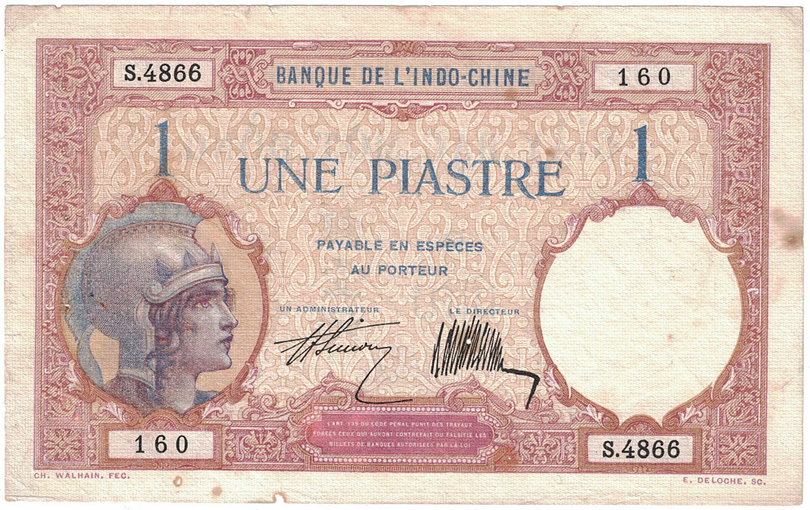 Bloqué au lit depuis quelques jours par un covid-2025 qui s’est invité avec rage dans mon organisme, j’en ai profité pour avancer sur un billet assez commun du futur ouvrage consacré aux billets de la Banque de l’Indochine. Cette coupure est le 1 piastre type 1921 Wahlain (1), émis une première fois en 1923 à 50 000 000 d’exemplaires (2000 alphabets de 25000 billets), puis une seconde fois en 1927 à 48 025 000 exemplaires (1921 alphabets de 25000 billets). La coupure ne comporte pas de date d’émission. Deux combinaisons de signatures sont connues :