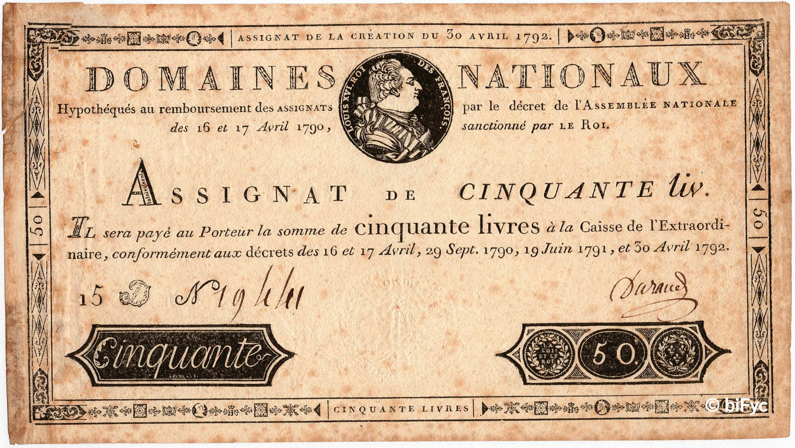 Des assignats de 50 livres à 2000 livres sont émis à partir de 1790 et malgré leur cours forcé, les français n’ont aucune confiance en ces bouts de papier, qui accélèrent la thésaurisation de la monnaie métallique. Ces assignats, dont la plus petite valeur faciale est de 50 livres, représentent une somme trop importante pour les dépenses du quotidien, le salaire moyen journalier d’un ouvrier étant de seulement une livre :