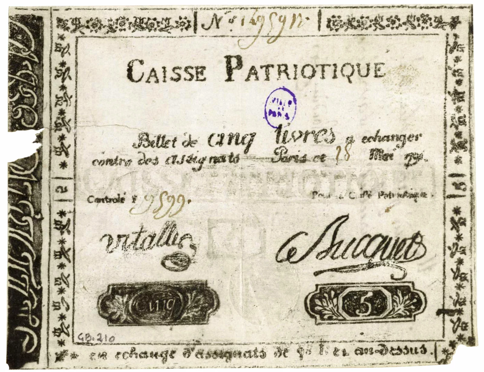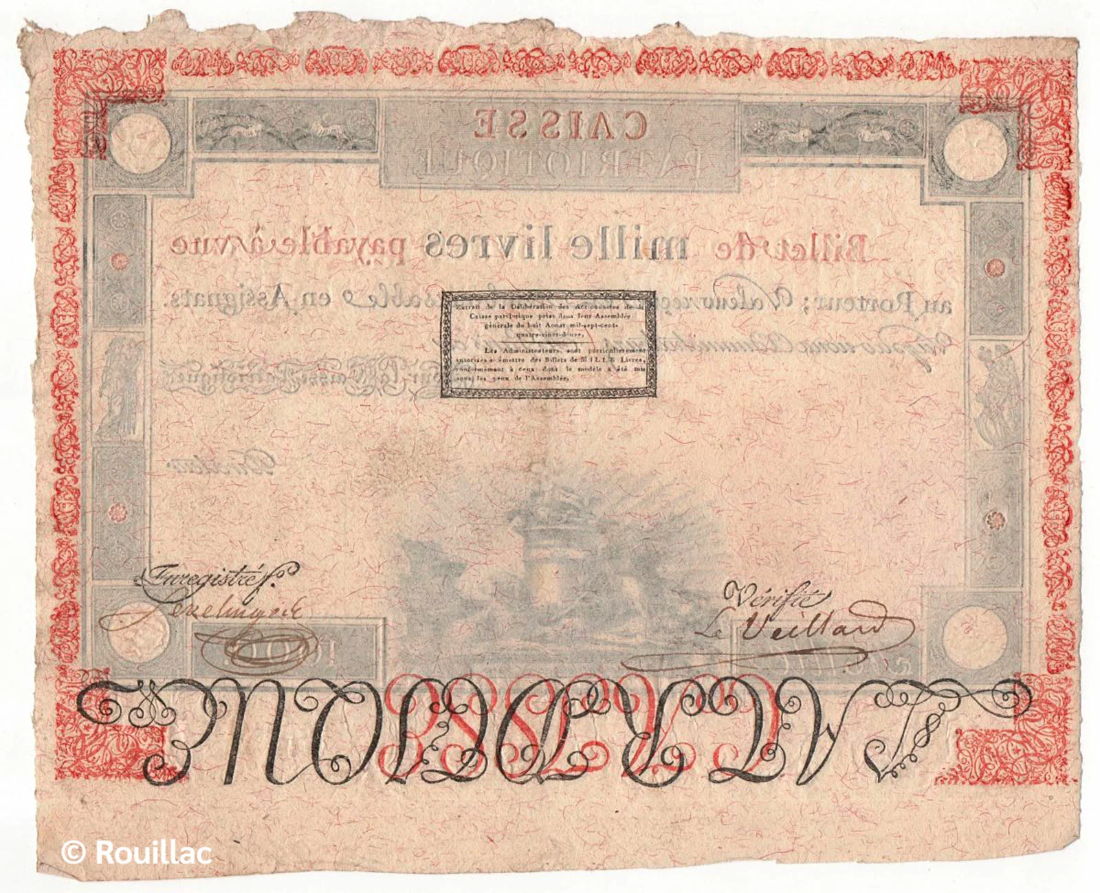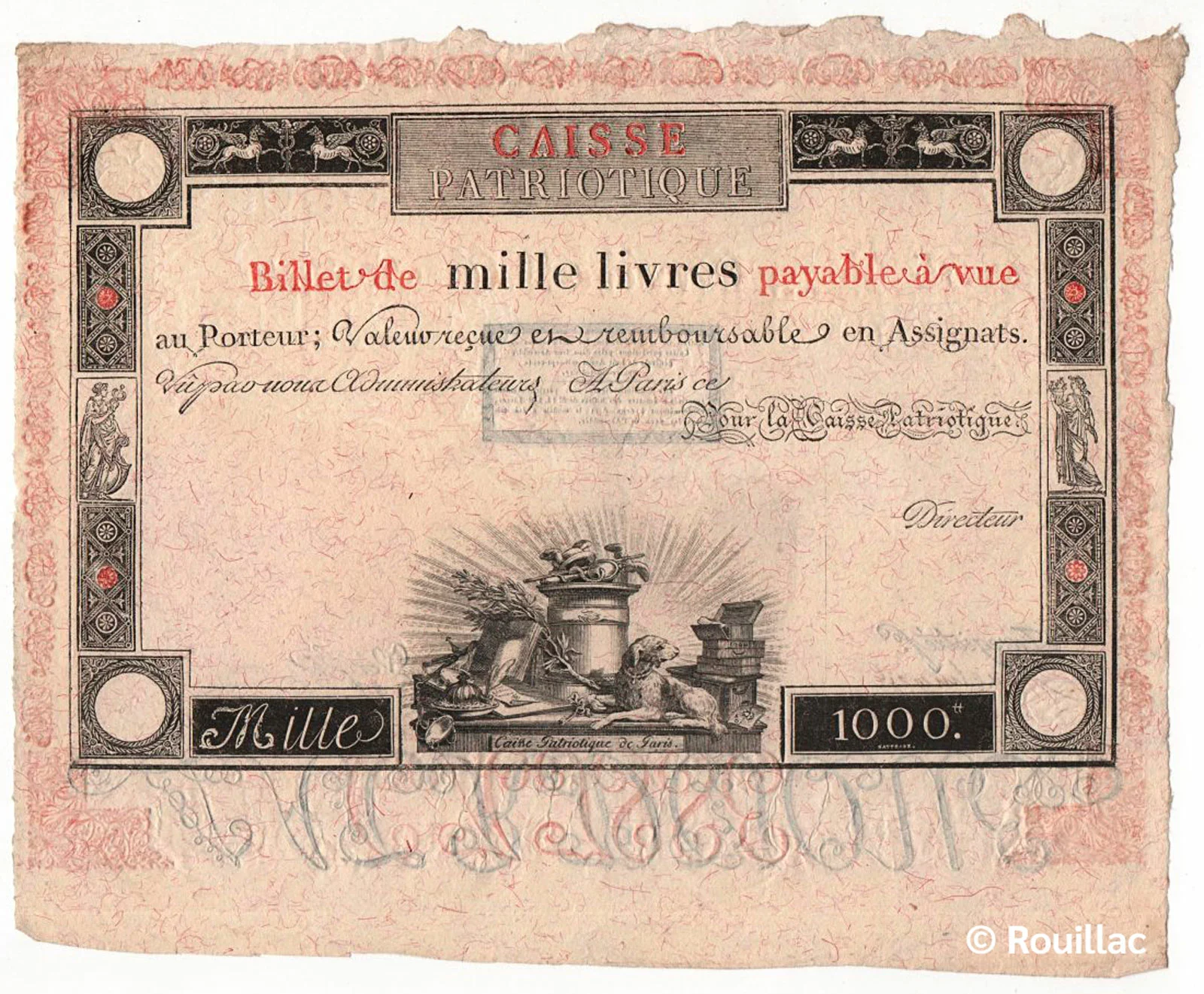 Bien que l’objectif initial des caisses patriotiques étaient d’émettre de billets de petites valeurs, un prototype d’un montant de 1000 livres sera élaboré en 1792 mais finalement non émis :