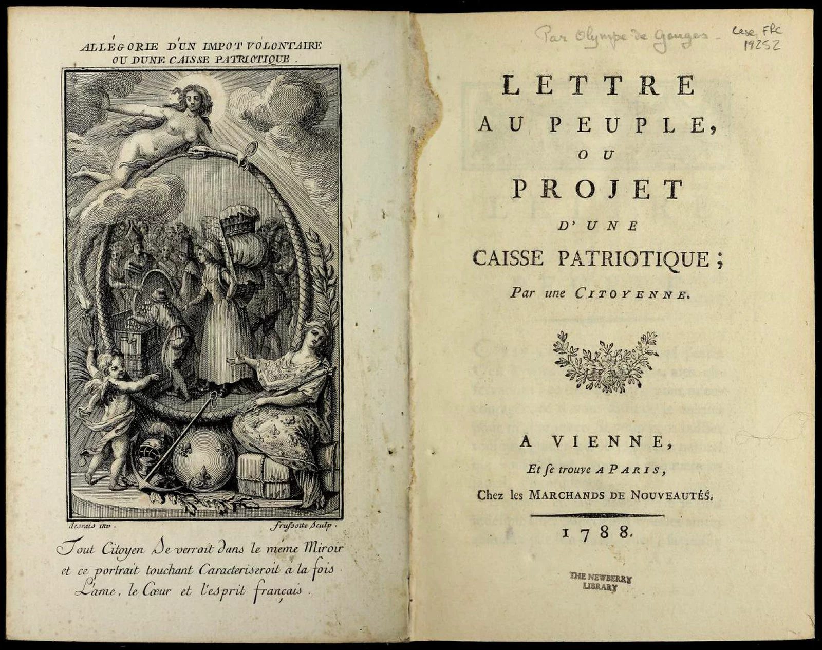À la fin de l’Ancien Régime, puis au début de la Révolution, la monarchie et l’Assemblée font face à une situation dramatique. Les recettes fiscales s’effondrent, la confiance dans l’État par le peuple est gravement entamée et la banqueroute menace. Pour éviter l’effondrement financier, les révolutionnaires cherchent des solutions nouvelles. Parmi elles, une idée s’impose : faire appel directement aux citoyens, non seulement par l’impôt, mais aussi par des dons et prêts à la Nation. C’est une femme, pionnière française du féminisme, Olympe de Gouges (1748-1793), qui la première, propose la création d’une caisse patriotique, dans une lettre manuscrite adressée au duc d’Orléans, le 4 juillet 1789 :