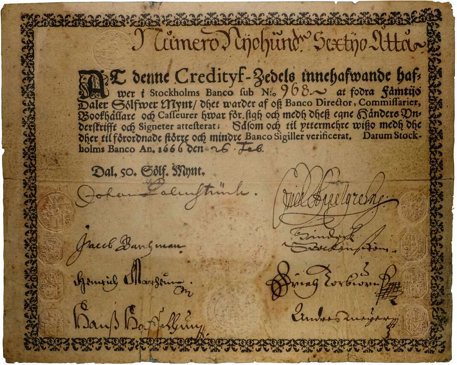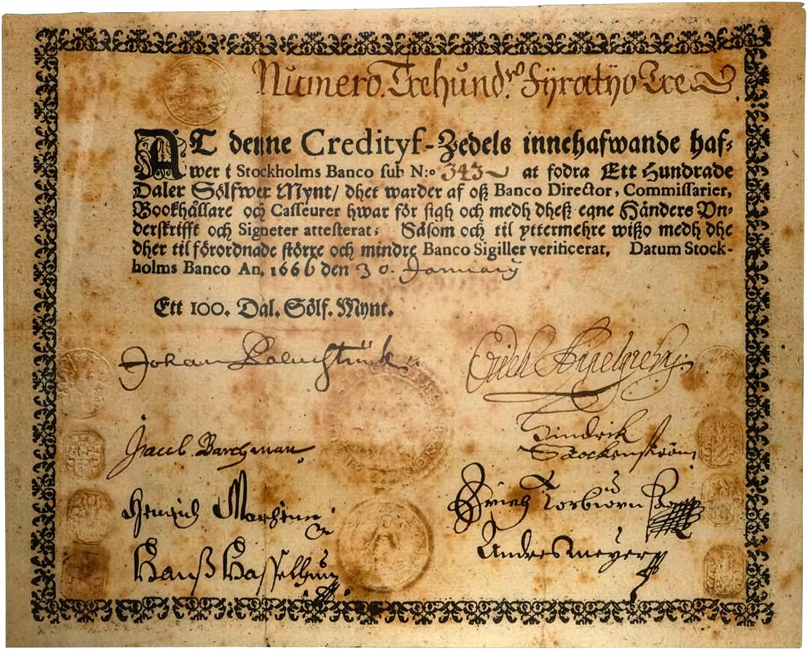 Les premiers billets sont émis en 1661 en dalers de cuivre et en dalers d’argent, mais aucun exemplaire n’a survécu. Entre 1662 et 1664, plusieurs émissions se succèdent. Les plus célèbres sont ceux de 1666, connus sous le nom de Palmstruchers. Les coupures sont libellées en valeurs de 100, 50, 25 et 10 Daler Silvermynt type 1666 :