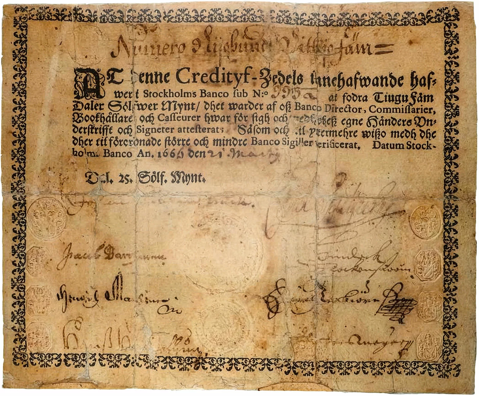 L’utilisation des lourdes plaques de cuivre étant peu adaptée aux paiements importants, le papier-monnaie fait déjà son apparition en Suède sous forme de certificats de dépôt non rémunérés. Les clients de la Stockholms Banco déposent une partie de leurs plaques dans les coffres de la banque et reçoivent en échange ces documents papier.