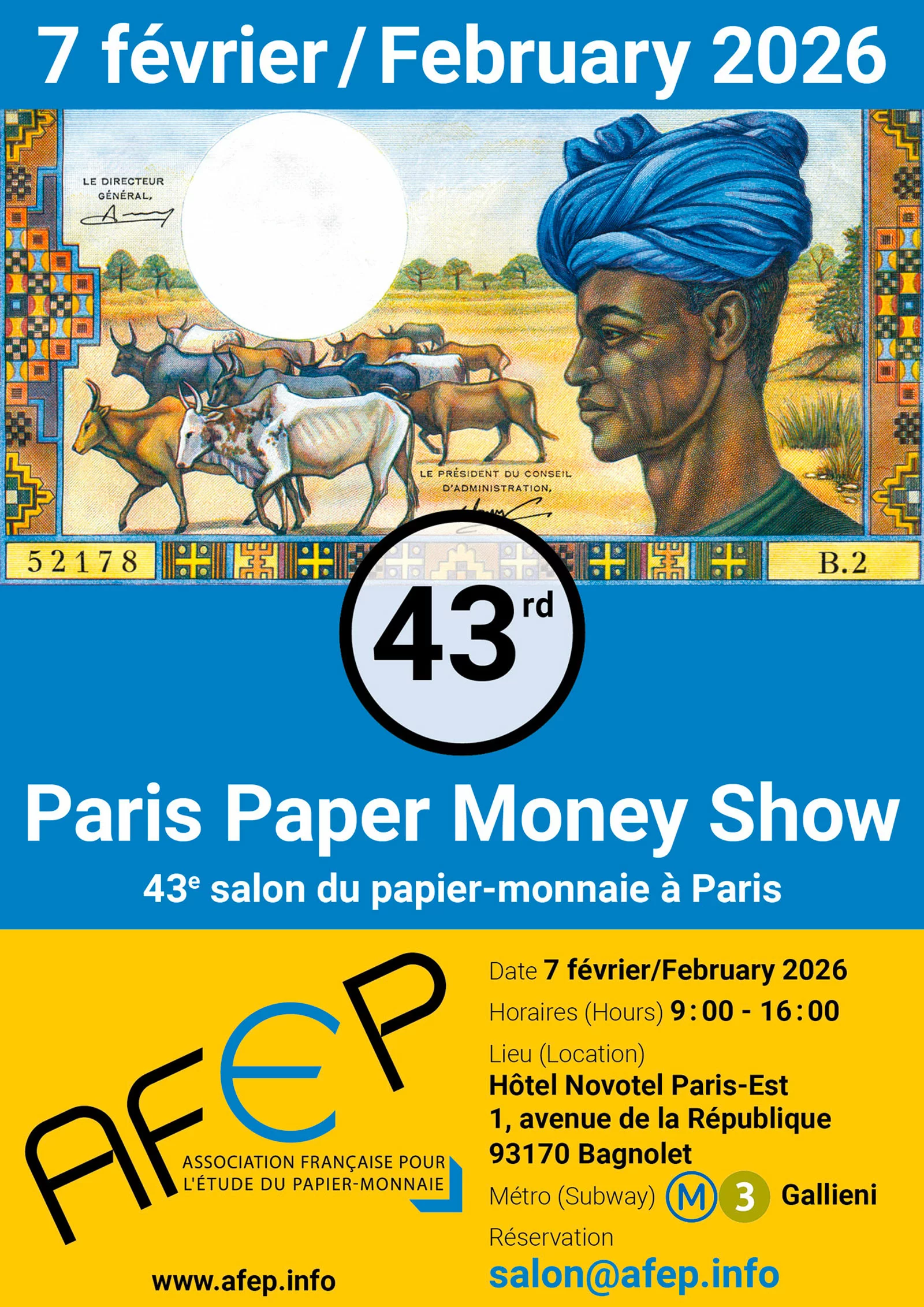 Petit mémo pour les collectionneurs, le 43e salon de l’AFEP (Association Française pour l’Étude du Papier-Monnaie) se tiendra le samedi 7 février 2026 à l’hôtel Novotel de la Porte de Bagnolet. De nombreux professionnels y seront présents pour vous proposer leurs albums de billets à vendre. Je rappelle que ce salon est exclusivement consacré au billets de banque de collections.