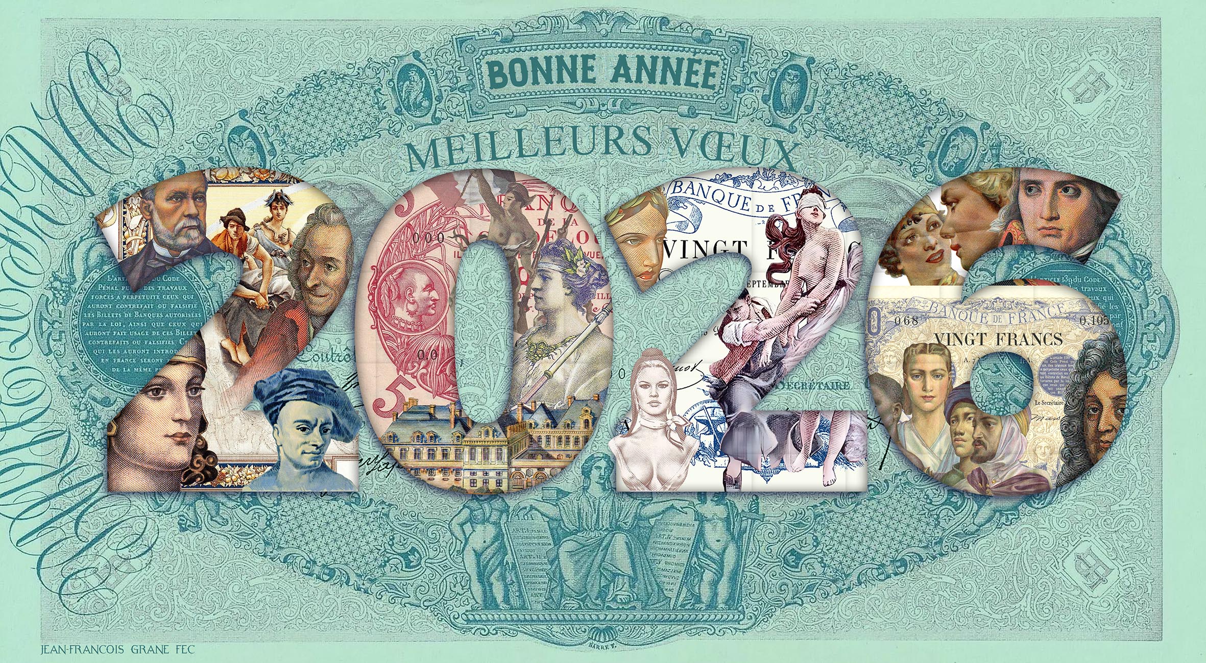 Bonjour à tous, je ne peux m’empêcher de publier cette belle carte de vœux avec un hommage prémonitoire à BB (Brigitte Bardot). Cette carte a été réalisée par un graphiste bordelais, lecteur de biFyc et… nouveau collectionneur de billets de banque anciens ! Merci Jean-François et bienvenue dans l’univers passionnant de la collection des billets.