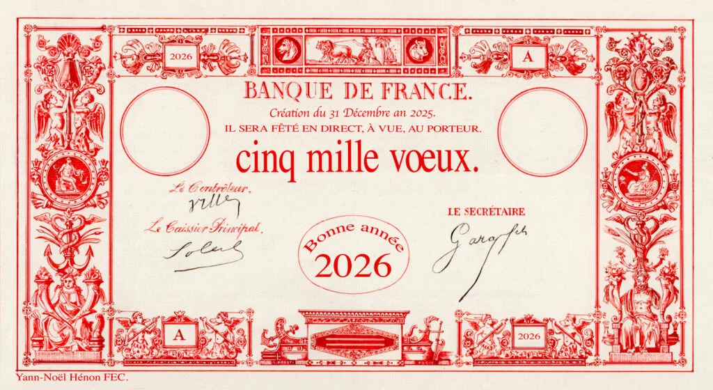 La carte de vœux ci-dessus est un montage réalisé à partir d’un dessin reproduisant le mythique billet de 5000 francs BDF type 1846 (encre rouge), un dessin ayant fait l’objet d’un article biFyc le 26 décembre 2023.